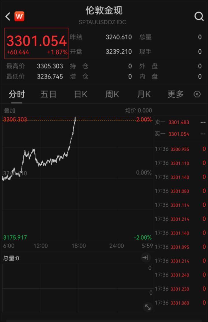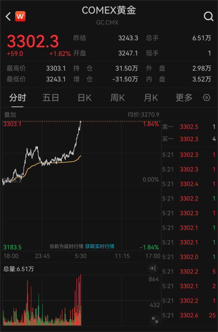 5月5日,黄金期货和现货价格均再次突破3300美元/盎司关口。截至发稿,COMEX黄金报3302.3美元/盎司,上涨1.82%;伦敦金现报3301.054美元/盎司,上涨1.87%。